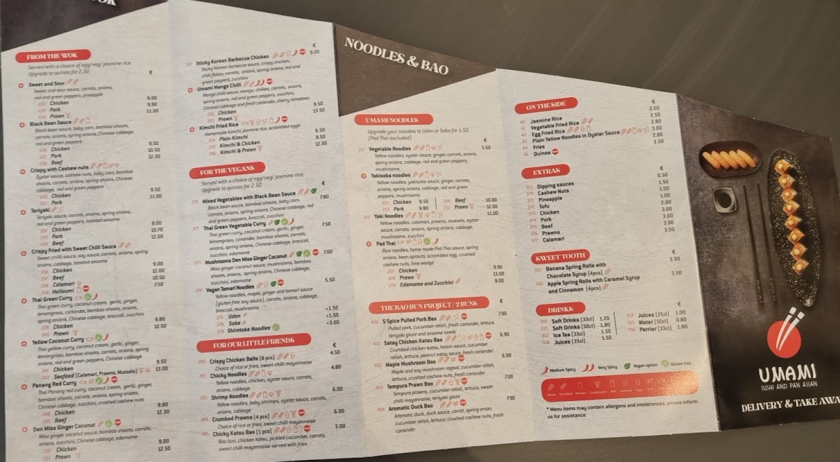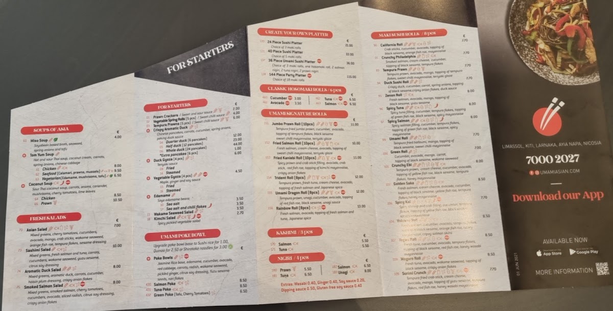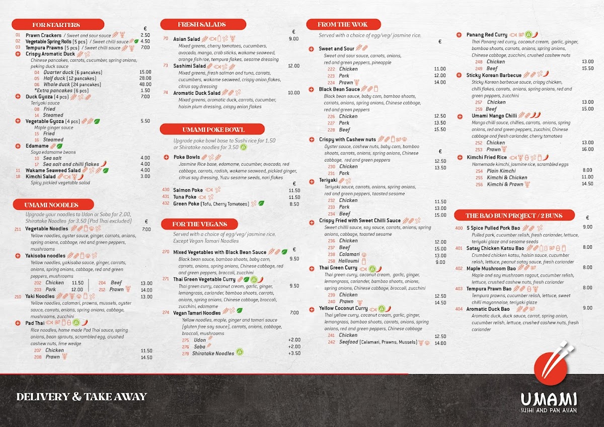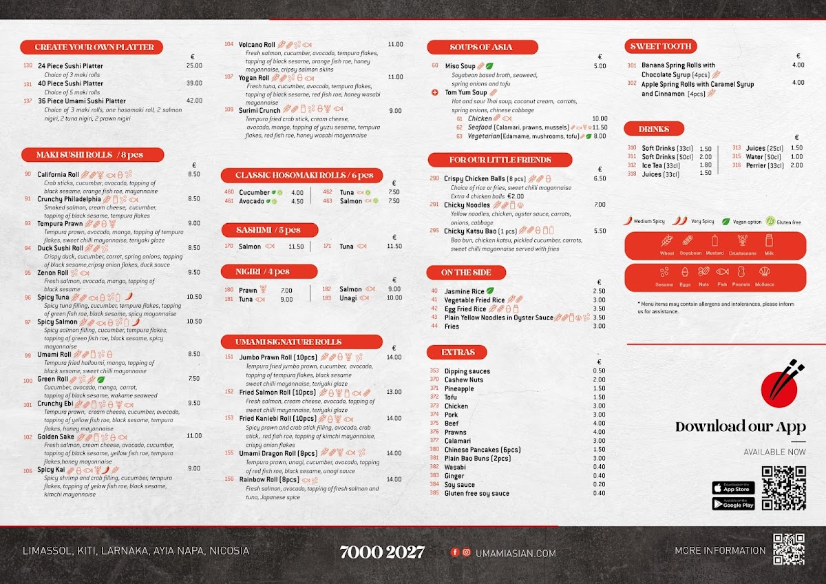 Umami Sushi and Pan Asian offers a diverse and vibrant menu with an array of delicious dishes catering to various tastes. Their Poke Bowls stand out, including options like the Green Poke Bowl, Pan Seared Salmon Poke, and the Prawn Poke Bowl. If you're in the mood for sushi, their selection includes Tuna Sashimi (5 Pieces), Salmon Sashimi (5 Pieces), and a variety of Nigiri, such as Prawn Nigiri (4 Pieces) and Unagi Nigiri (4 Pieces). The Umami Signature Rolls, like the Unagi Roll (8 Pieces) and Rainbow Roll (8 Pieces), are perfect for those seeking a flavorful twist on traditional rolls. For those who enjoy hearty noodle dishes, the Chicken Pad Thai (Spicy) and Beef Yakisoba Noodles are popular choices. Additionally, the Festive Menu adds a special touch with creative dishes such as the Santa’s Salmon Roll and Crimson Crunch Bao. Don’t forget to try some Bao Buns like the Tempura Prawn Bao (2 Pieces) or the Maple Duck Bao (2 Pieces). The drink menu offers both alcoholic options like Carlsberg Bottle 330ml and Aes Ampelis White Wine 187ml, as well as refreshing non-alcoholic drinks such as Lanitis Apple Juice 330ml. For dessert, indulge in their Salted Caramel Mochi Ice Cream or Tropical Mochi Ice Cream. Whether you're visiting for a casual meal or a special occasion, Umami’s diverse and flavorful offerings ensure a memorable dining experience.